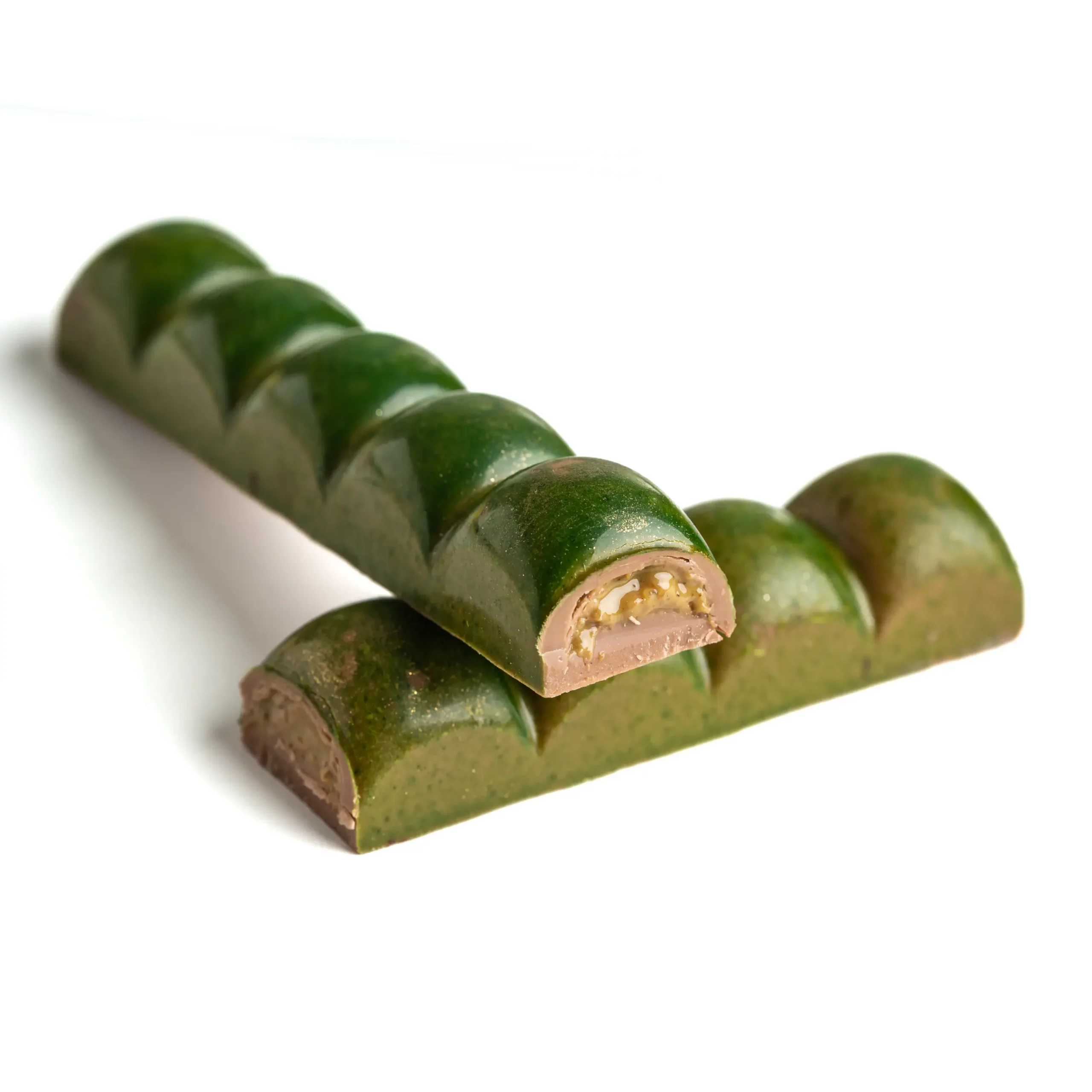 Ingrédients : Pâte de pistache, sucre, beurre, couverture lait 35% (sucre, beurre de cacao, lait en poudre, pâte de cacao, émulsifiant : lécithine de soja) , feuilletine ( farine de BLÉ (41.5 %), sucre (46 %) ; beurre concentré (LAIT) 8.0% ; sucre du LAIT ; protéines de LAIT ; sel ; extrait de malt (ORGE) ; poudre à lever: E500ii, sel