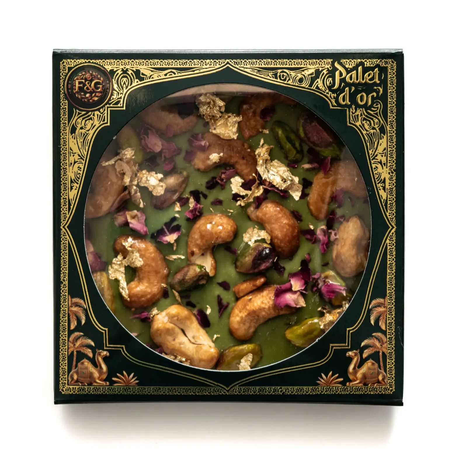Ingrédients : Couverture chocolat Dulcey 35% (beurre de cacao, sucre, LAIT entier en poudre, LAIT écrémé en poudre, lactosérum (LAIT), beurre (LAIT), émulsifiant: lécithine de Tournesol, extrait naturel de vanille), pistache, yaourt lyophilisé, pétale de rose, colorant vert liposoluble, extrait naturel de fleurs.