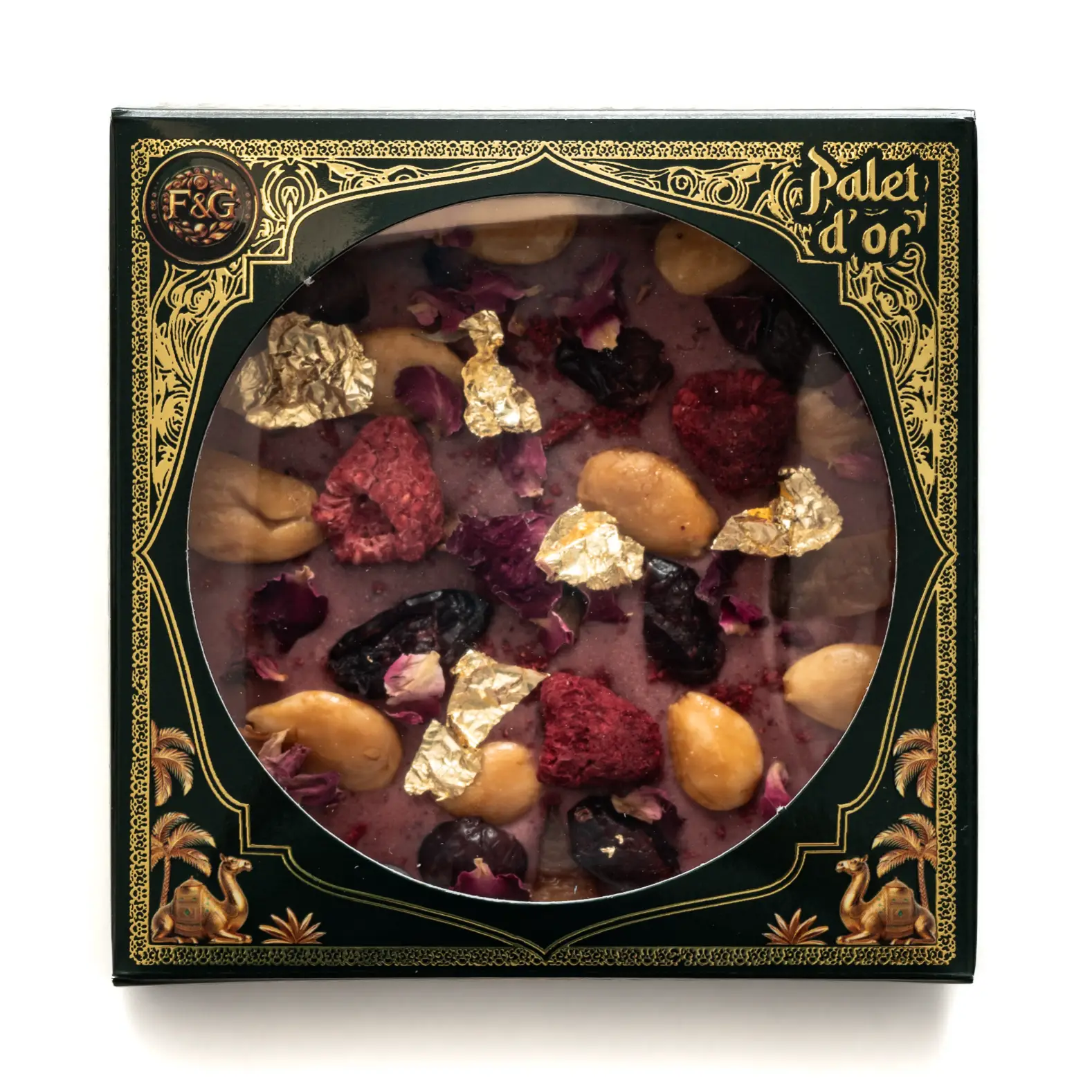 Ingrédients : Couverture Ruby (sucre, beurre de cacao, lait entier en poudre, lécithine de soja), betterave lyophilisée, amande caramélisée, cranberry, framboise, litchi, pétale de rose, colorant rose liposoluble.
